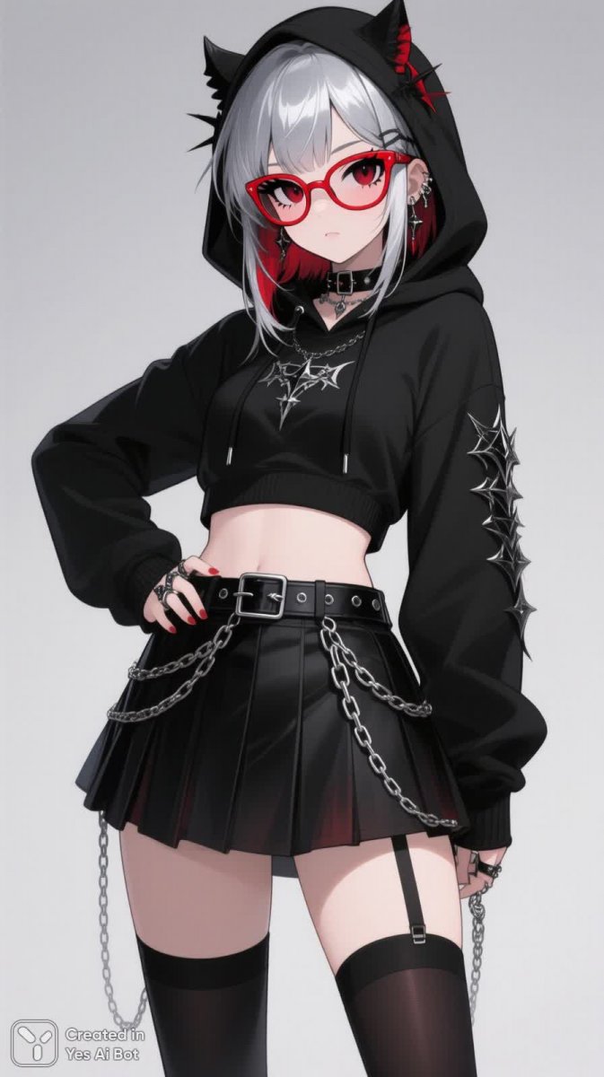 emo girl with silver-streaked hair, large red glasses, dark eyeliner, black cropped hoodie featuring punk details, skirt with chains, leg warmers, striking a confident pose, soft gray background, focus on accessories, artistic vibe.