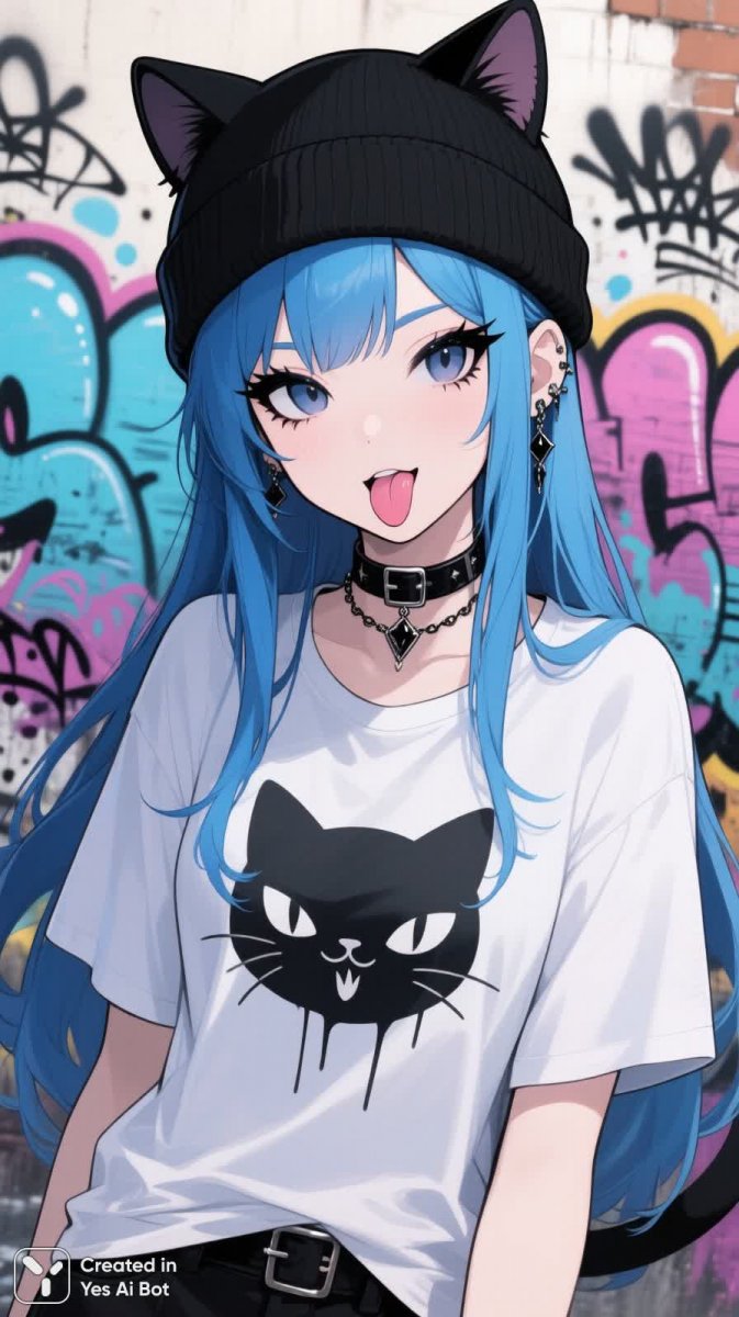 pale-skinned girl with long blue hair, intense eyeliner, choker necklace, black beanie with cat ears, wearing oversized t-shirt, striking pose with tongue out, graffiti background, playful atmosphere.