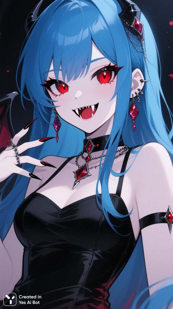 cartoon anime girl, vampire girl with long blue hair, sharp nails, fangs, playful smile, wearing a stylish black dress, piercing red eyes, glittering accessories, anime digital art, bold outlines, ethereal lighting, intense gaze, modern gothic style.