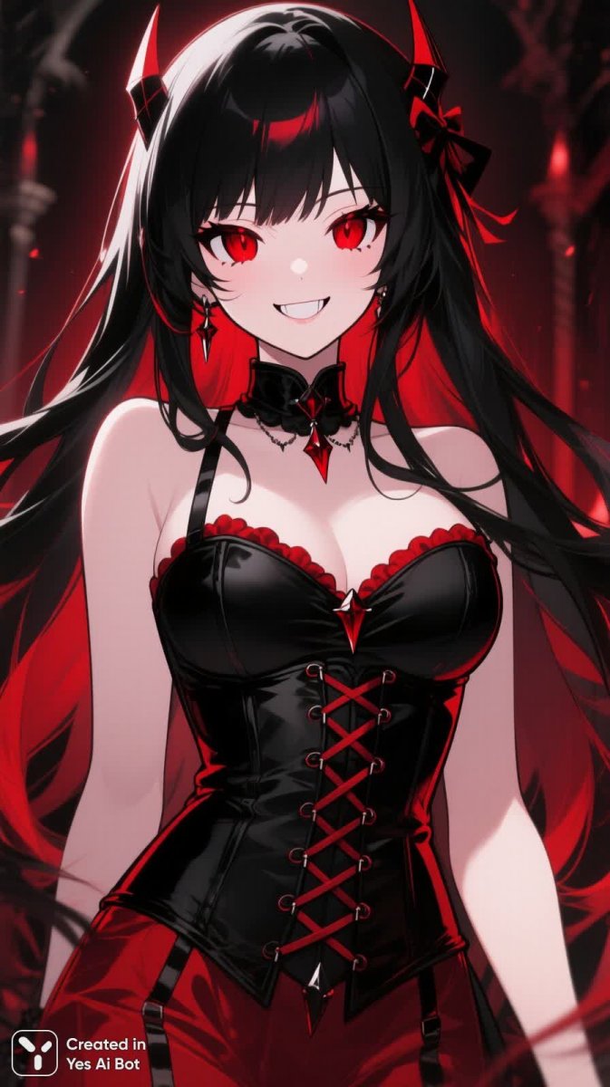 cartoon anime girl, beautiful vampire in a black and red corset, long black hair with red highlights, sharp nails, piercing red eyes, engaging smile, anime digital art, bold outlines, glamorous style, dramatic lighting, captivating aura.