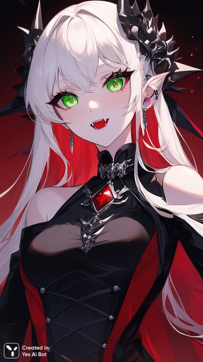 Загадочная вампирша с пленительной внешностью предстает перед зрителем в ярком образе аниме-персонажа. Длинные платиновые волосы ниспадают волнами, подчеркивая ее утонченный силуэт и добавляя образу неземной блеск. Пронзительные изумрудно-зеленые глаза излучают магнетизм и скрывают в себе тайны ночи. Острые клыки намекают на ее истинную сущность – хищницу, способную очаровать одним лишь взглядом. Изящные кольца украшают тонкие пальцы, добавляя шарма и загадочности ее облику. Гладкая, сияющая кожа создает впечатление нереальной красоты и совершенства. Темный наряд подчеркивает ее элегантность и усиливает ощущение опасности, скрывающейся за маской очарования. Стиль аниме с четкими контурами и мягким освещением придает изображению легкость и воздушность. Выражение лица – это смесь невинности и соблазна, загадочности и силы, которое невозможно забыть. Ее образ полон таинственной привлекательности и завораживает своей красотой. Эта девушка-вампир – воплощение темной элегантности и притягательного очарования, способного покорить любого, кто осмелится взглянуть в ее глаза. Она - олицетворение ночи, сотканное из теней и света, красоты и опасности