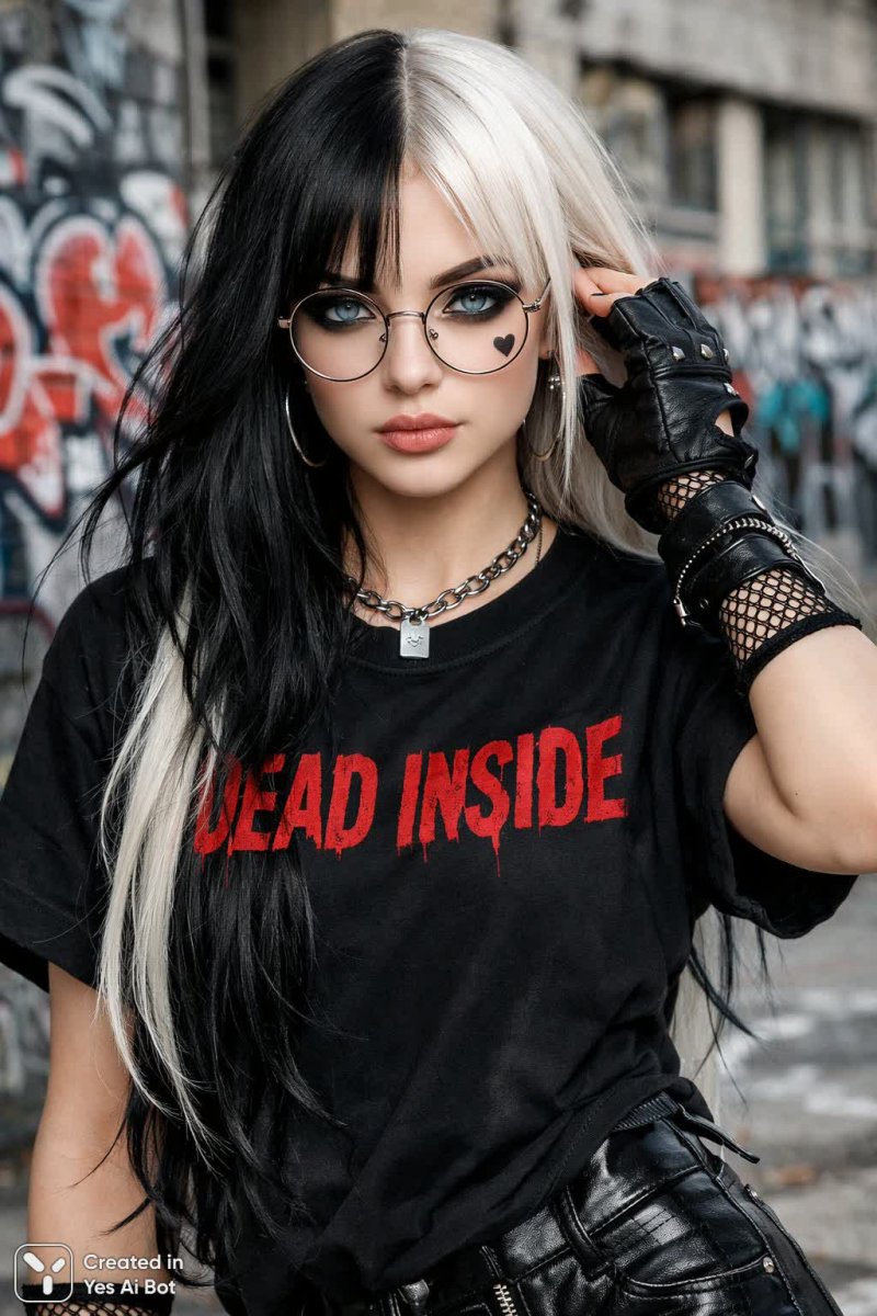 1. emo girl with long hair half black half white, fierce blue eyes, round glasses, black band tee with red words, heart tattoo under eye, fingerless fishnet gloves, striking pose, urban background with graffiti, digital art style.