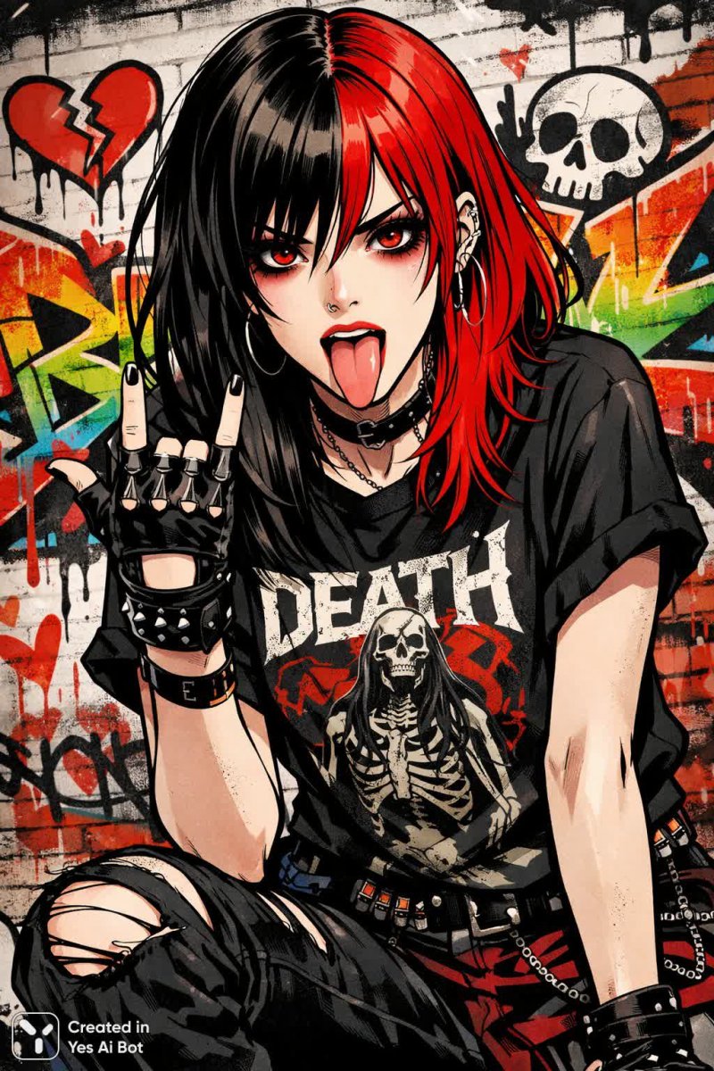 3. emo style girl with half black half red hair, expressive red eyes, black band t-shirt, fingerless gloves, fierce pose with tongue out, vivid graffiti in background, comic illustration style, melancholic vibe.