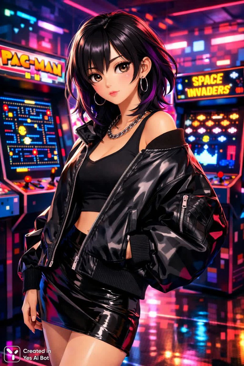 5. cartoon anime girl in a neon arcade, wearing a black bomber jacket, looking excited; BG: glowing arcade machines, pixel art vibes, bright color contrast, lively energy.