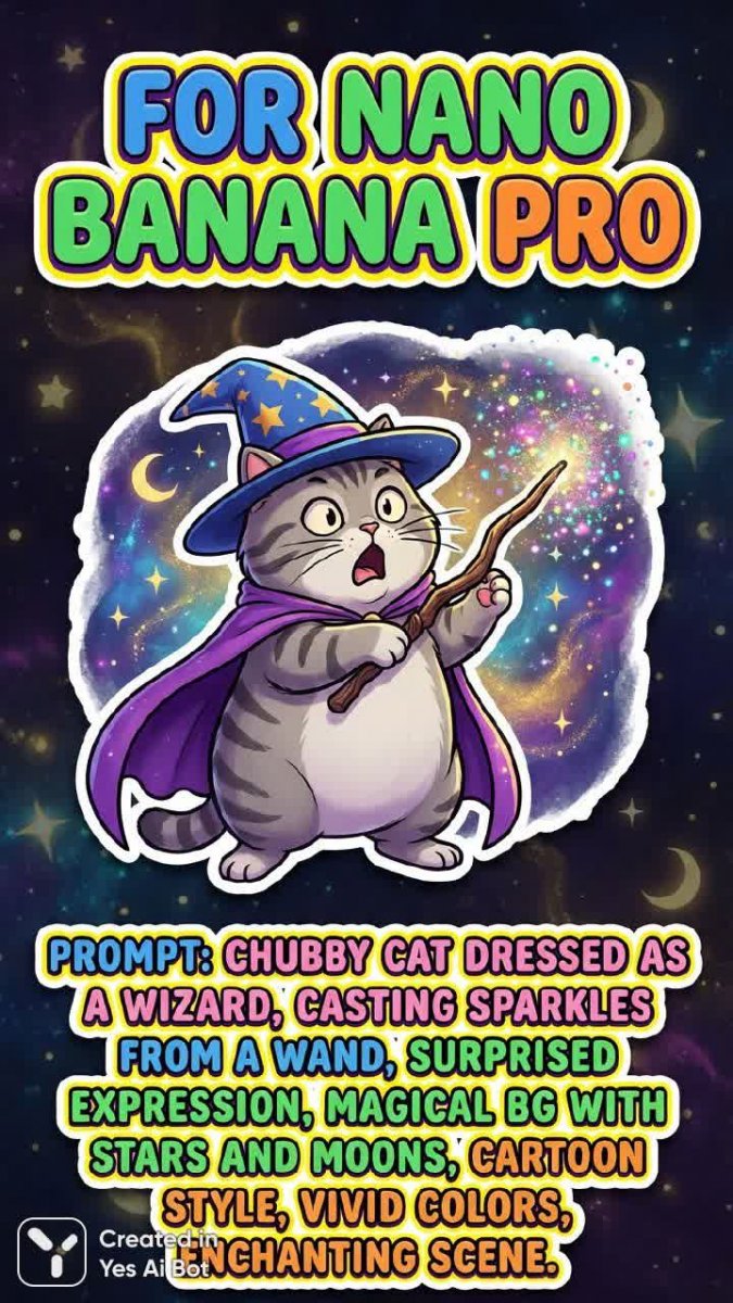 2. sticker style bold text, thick outline, drop shadow, vibrant colors, legible on top the image: "FOR Nano Banana Pro" and sticker style bold text, thick outline, drop shadow, vibrant colors, legible at the bottom of the image: "Prompt: chubby cat dressed as a wizard, casting sparkles from a wand, surprised expression, magical BG with stars and moons, cartoon style, vivid colors, enchanting scene."