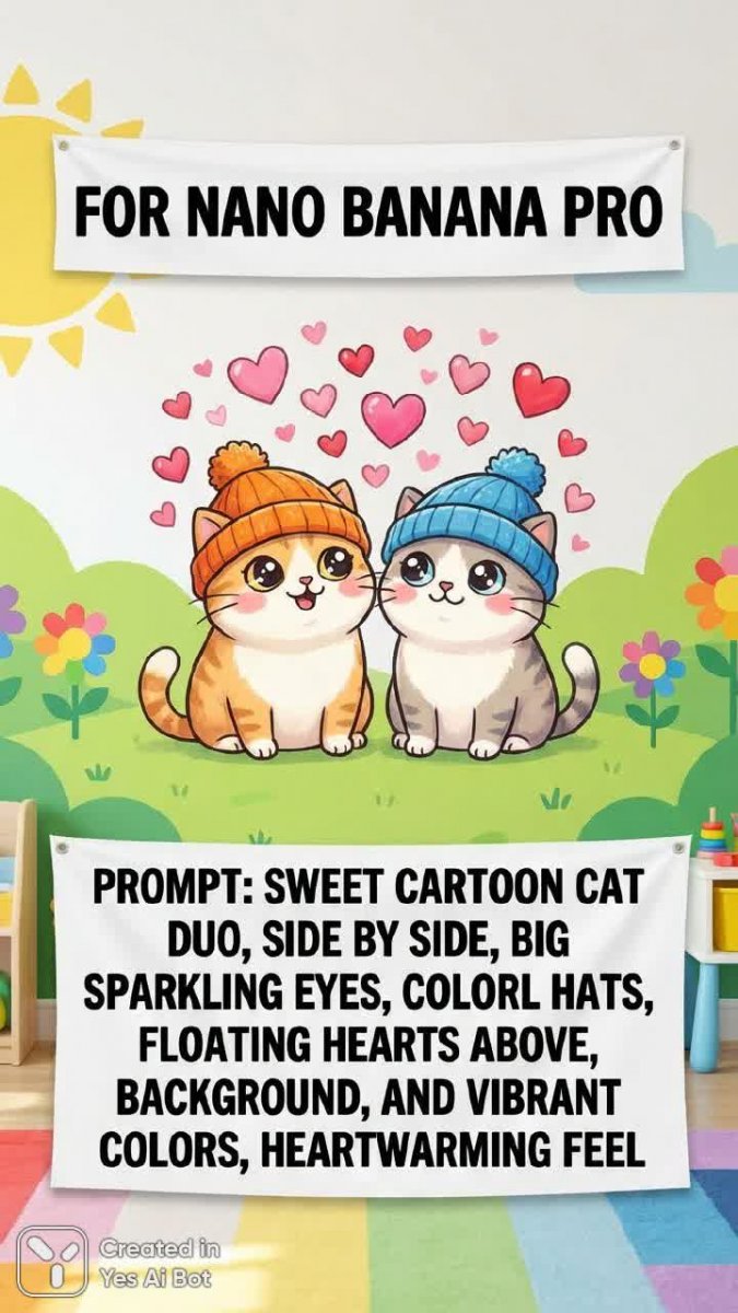 3. bold black text on white bunner: "For Nano Banana Pro" AND bold black text on white bunner: "Prompt: sweet cartoon cat duo, side by side, big sparkling eyes, wearing colorful hats, floating hearts above, cheerful background, and vibrant colors, heartwarming feel"