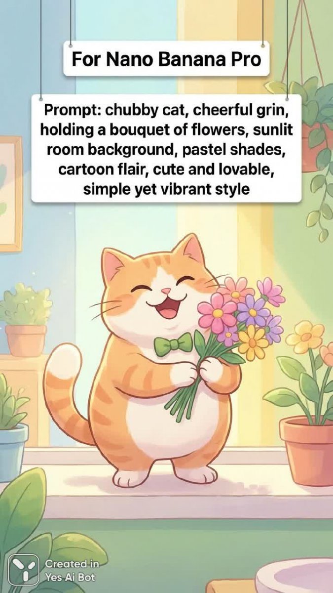 4. black text on white bunner: "For Nano Banana Pro" AND black text on white bunner: "Prompt: chubby cat, cheerful grin, holding a bouquet of flowers, sunlit room background, pastel shades, cartoon flair, cute and lovable, simple yet vibrant style"