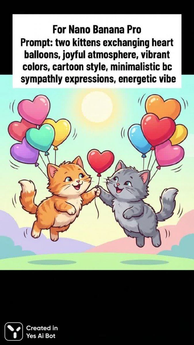 2. bold black text on white bunner: "For Nano Banana Pro" AND bold black text on white bunner: "Prompt: two kittens exchanging heart balloons, joyful atmosphere, vibrant colors, cartoon style, minimalistic backdrop, lovely expressions, energetic vibe"