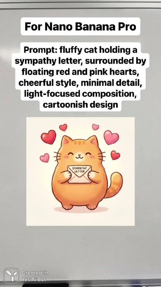 3. bold black text on white bunner: "For Nano Banana Pro" AND bold black text on white bunner: "Prompt: fluffy cat holding a love letter, surrounded by floating red and pink hearts, cheerful style, minimal detail, light-focused composition, cartoonish design"