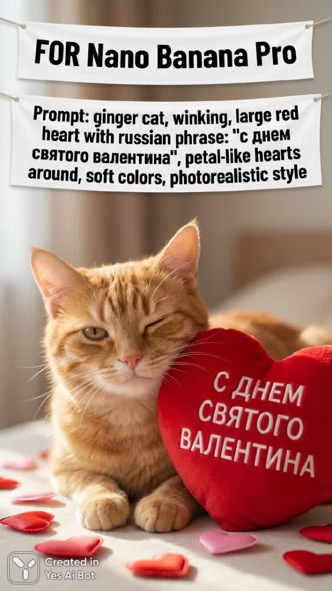 4. bold black text on white bunner: "FOR Nano Banana Pro" AND bold black text on white bunner: "Prompt: ginger cat, winking, large red heart with russian phrase: 'с днем святого валентина', petal-like hearts around, soft colors, photorealistic style"