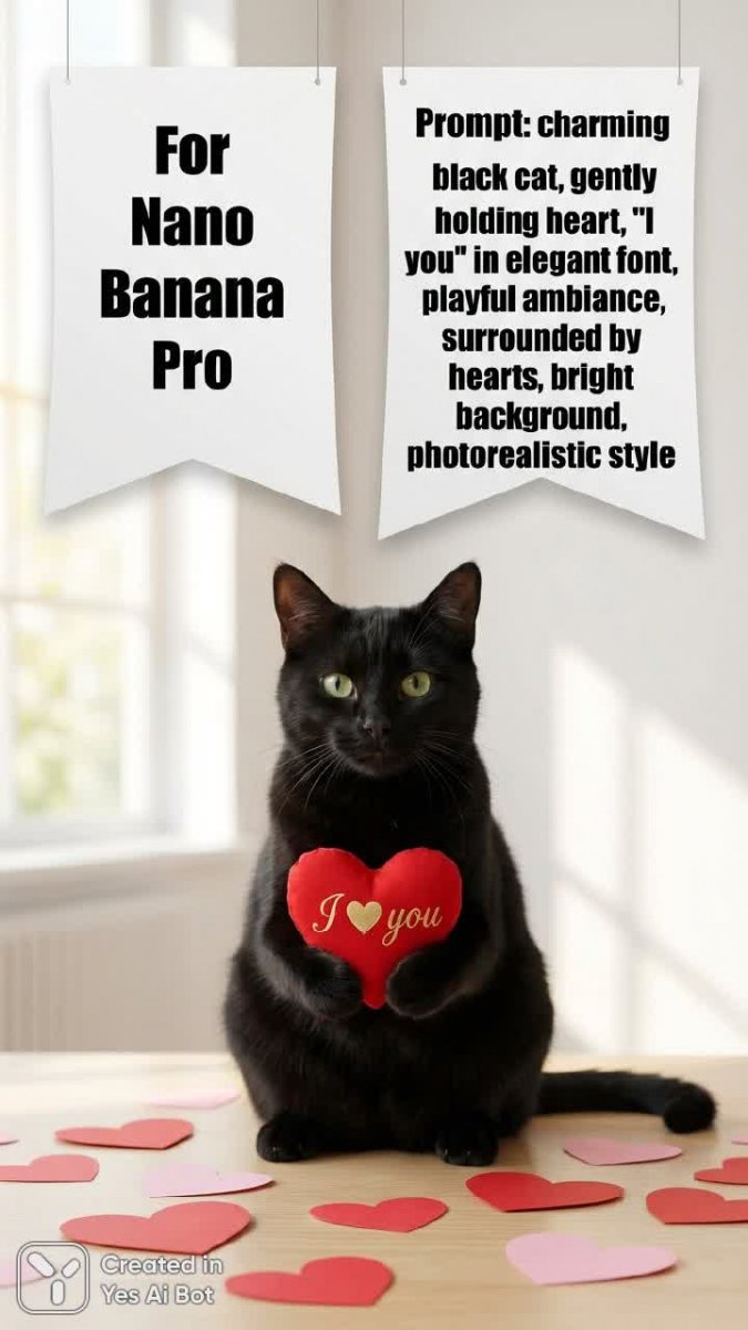 4. bold black text on white paper bunner: "For Nano Banana Pro" AND bold black text on white paper bunner: "Prompt: charming black cat, gently holding heart, 'I ❤️ you' in elegant font, playful ambiance, surrounded by mini hearts, bright background, photorealistic style"