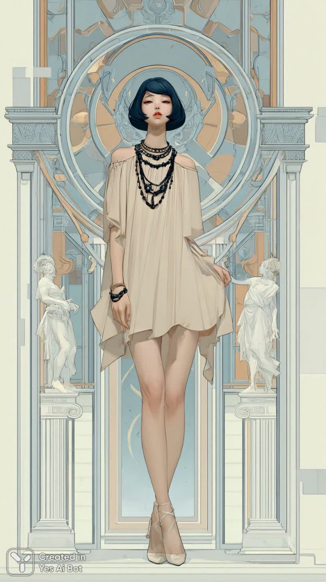 Изысканный портрет современной женщины, воплощающий собой гармонию моды и искусства. В центре внимания – элегантная дама с короткой черной стрижкой и стильной челкой, обладающая необычным светлым оттенком кожи цвета небесной лазури. Ее образ дополнен изящным бежевым платьем, украшенным крупными черными бусами и длинными многослойными колье, создающими эффектный акцент. Яркие туфли на высоком каблуке добавляют динамики и подчеркивают ее уверенность, а минималистичные браслеты на запястьях завершают образ сдержанной роскоши. Фоном для этой завораживающей фигуры служит лаконичный интерьер в стиле модерн. Пространство заполнено прозрачными рамками различных цветов, создающими игру света и тени, а классический бюст, установленный на колонне, добавляет нотку изысканной старины. Пастельная цветовая гамма создает атмосферу спокойствия и умиротворения, смягчая резкость геометрических форм. Абстрактные фигуры в качестве фона придают композиции глубину и загадочность, а общий стиль иллюстрации сочетает в себе современность и классические мотивы, создавая неповторимую эстетическую ценность. Этот образ – ода красоте, элегантности и творческому самовыражению