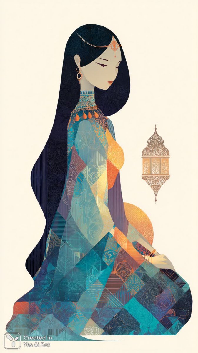 Завораживающая абстрактная иллюстрация современной женщины в восточном стиле поражает своей красотой и гармонией. Яркие насыщенные цвета создают атмосферу праздника и таинственности, а длинные черные волосы контрастируют с геометрическими формами, придавая образу динамичность и выразительность. Изящные украшения на лбу и шее подчеркивают утонченность и благородство женщины, сидящей на полу в минималистичной композиции. Белый фон позволяет выделить главную героиню и акцентировать внимание на деталях ее образа. Декоративный светильник с черепом добавляет интригующий элемент, сочетая традиционные восточные мотивы с современным абстрактным искусством. Эта flat illustration отличается высоким качеством исполнения, демонстрируя мастерство художника в создании стильного и запоминающегося произведения искусства. Иллюстрация идеально подходит для использования в дизайне интерьера графических материалов или как часть арт-проекта, вдохновляя своей оригинальностью и эстетической привлекательностью. Она воплощает собой гармоничное сочетание культурных традиций и современных тенденций в искусстве, создавая неповторимый визуальный образ