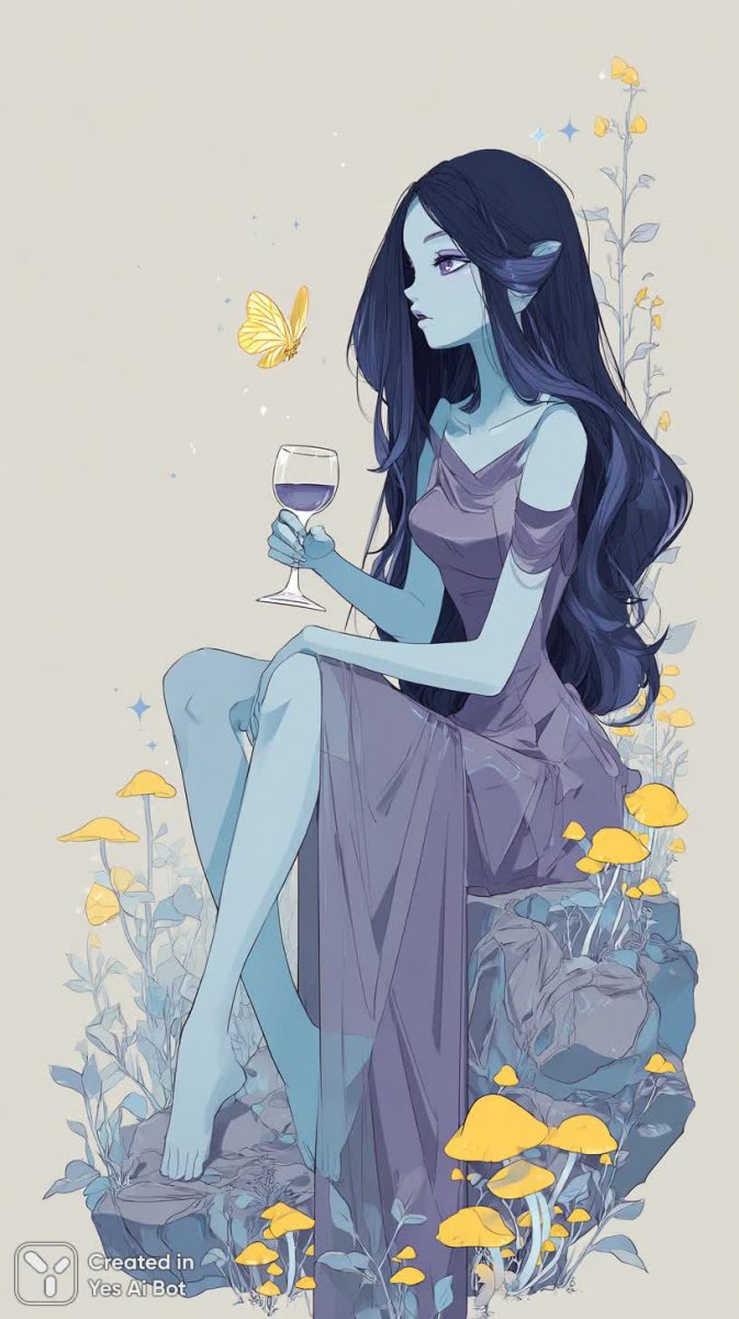 Загадочная девушка с длинными прямыми черными волосами, чья кожа переливается оттенками абстрактного синего, поражает глубиной и выразительностью своих темных глаз. Она грациозно восседает, держа в руках изящный бокал вина, словно созерцая вечность. Ее платье украшено асимметричными абстрактными узорами, создающими ощущение движения и легкости. Яркие пурпурные и красные драпировки мягко ниспадают на колени, добавляя образу чувственности и элегантности. В непосредственной близости от нее порхает яркий бабочка, словно символ свободы и переменчивости судьбы. Геометрические формы тела девушки подчеркивают ее уникальность и гармонию с окружающим миром. Стиль изображения – минималистичный, что позволяет сконцентрироваться на деталях и передать атмосферу спокойствия и созерцательности. На фоне простираются белые грибы, излучающие мягкое желтое свечение, создавая ощущение волшебства и загадочности. Цифровая иллюстрация выполнена в технике флэт-дизайна, что придает ей современный вид. Вся композиция пронизана духом современного искусства, сочетая в себе красоту, гармонию и нетривиальность. Это завораживающий портрет, воплощающий в себе загадку женственности и величие природы. Кажется, будто перед нами откровение из параллельного мира, где реальность переплетается с фантазией