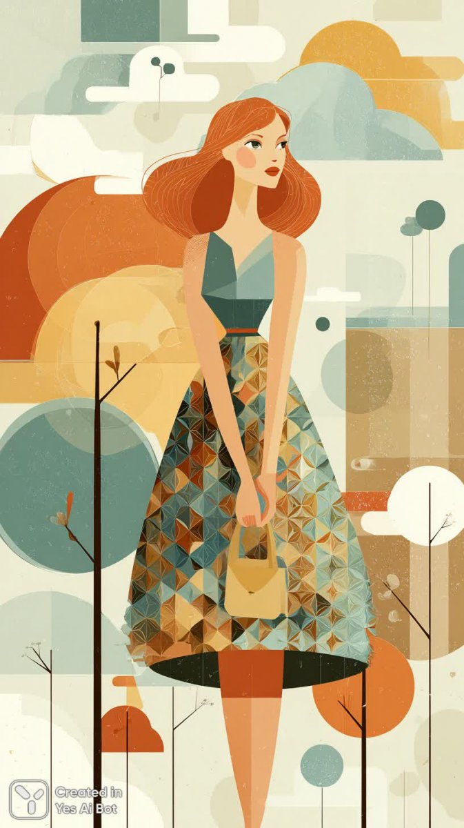 Яркая и минималистичная векторная иллюстрация в стиле флэт-дизайна вдохновлена работами Кристин Ульве. В центре композиции – девушка с длинными волнистыми волосами, одетая в юбку с абстрактным принтом и просторный широкополый панама. Она позирует с игривым настроением, демонстрируя непринужденную элегантность и молодость. Фон выполнен в стилизованной манере: схематичные деревья и пушистые облака создают ощущение летнего дня. Использование ярких цветовых блоков добавляет динамики и визуальной привлекательности изображению. Цифровое искусство, выполненное в технике плоского векторного рисунка, отличается четкими линиями и лаконичными формами, что подчеркивает современность и простоту дизайна. Картина излучает позитив и легкость, идеально подходя для оформления различных проектов, где требуется стильное и запоминающееся визуальное решение. Акцент на деталях в одежде и выразительная поза девушки делают иллюстрацию живой и эмоциональной, несмотря на минималистичный подход к исполнению. Она прекрасно подойдет для создания дизайна одежды, открыток или элементов веб-графики, добавляя нотку современного искусства и индивидуальности