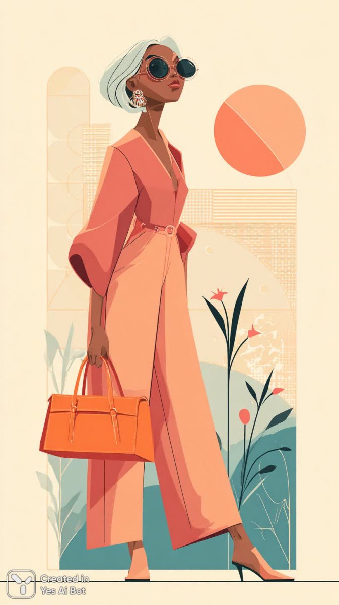 Элегантная женщина с длинными фиолетовыми волосами, украшенная изысканными серьгами и эффектными розовыми солнцезащитными очками в стиле ретро, предстает в образе винтажного полосатого комбинезона. В руках она держит яркую оранжевую сумочку, добавляющую акцент к тщательно продуманному наряду. За спиной – фон из красочных абстрактных форм, создающий атмосферу игривости и оригинальности. Изображение выполнено в минималистичной векторной графике с использованием принципов плоского дизайна, что придает ему современный и стильный вид. Вдохновение для работы было черпано из творчества Керстен Ульве, известной своей способностью создавать яркие и запоминающиеся визуальные образы. Композиция передает ощущение уверенности в себе и любви к моде, сочетая элементы ретро-стиля с современными тенденциями. Цветовая палитра выбрана таким образом, чтобы создать гармоничный и привлекательный контраст, подчеркивающий индивидуальность модели. Этот образ идеально подходит для тех, кто ценит оригинальный стиль и не боится экспериментировать с цветами и формами. В целом, работа представляет собой яркий пример современного векторного искусства, сочетающего в себе эстетику ретро и минималистичный дизайн, вдохновленный творчеством Керстен Ульве