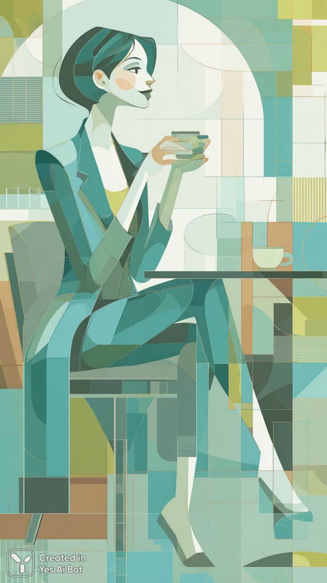 Стильная женщина с развевающимися зелеными волосами, облаченная в объемный жакет, наслаждается чашкой кофе, удобно расположившись в современном кафе. Яркий и стилизованный фон подчеркивает минималистичный векторный рисунок, создавая ощущение чистоты и изящества. Вдохновленный работами Кристана Ульве, этот образ воплощает собой современную эстетику, сочетая в себе смелость цветовых решений и лаконичность линий. Картина излучает спокойствие и уверенность, передавая атмосферу утреннего города и момент наслаждения простыми радостями жизни. Это не просто иллюстрация, а визуальная история о моде, стиле и индивидуальности, выполненная с безупречной точностью и вниманием к деталям. Использование векторной графики обеспечивает четкость изображения и позволяет легко масштабировать его без потери качества, делая его идеальным для различных целей – от оформления веб-сайтов до печати на одежде или аксессуарах. Вся композиция пронизана духом современного искусства и дизайна, предлагая зрителю погрузиться в мир ярких красок и минималистичных форм