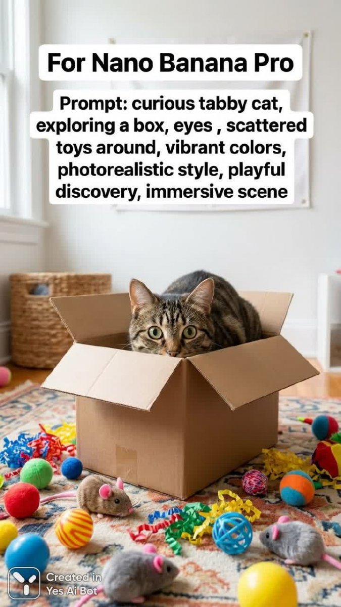 bold black text on white bunner: "For Nano Banana Pro" AND bold black text on white bunner: "Prompt: curious tabby cat, exploring a box, eyes wide open, scattered toys around, vibrant colors, photorealistic style, playful discovery, immersive scene"