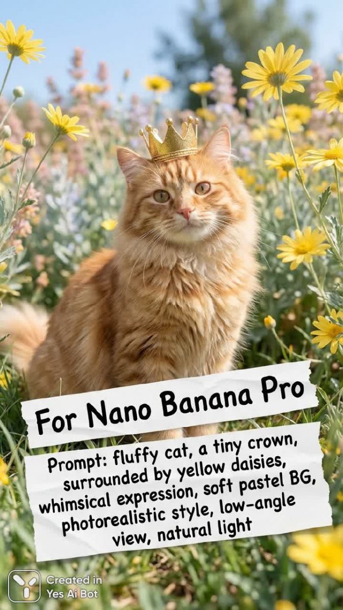 bold black text on white paper bunner: "For Nano Banana Pro" AND bold black text on white paper bunner: "Prompt: fluffy cat, wearing a tiny crown, surrounded by yellow daisies, whimsical expression, soft pastel BG, photorealistic style, low-angle view, natural light"