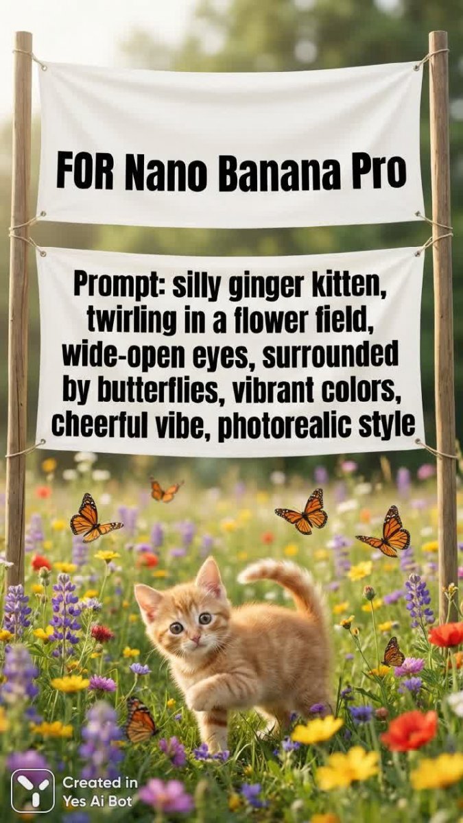 bold black text on white bunner: "FOR Nano Banana Pro" AND bold black text on white bunner: "Prompt: silly ginger kitten, twirling in a flower field, wide-open eyes, surrounded by butterflies, vibrant colors, cheerful vibe, photorealistic style"