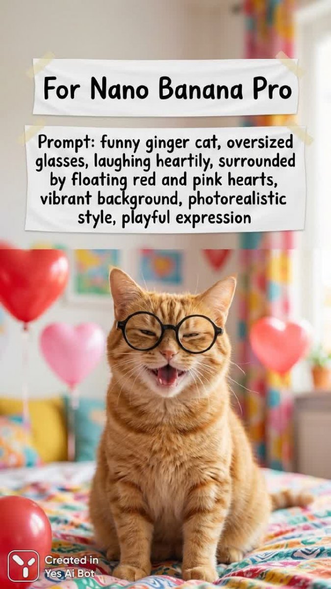 bold black text on white bunner: "For Nano Banana Pro" AND bold black text on white bunner: "Prompt: funny ginger cat, oversized glasses, laughing heartily, surrounded by floating red and pink hearts, vibrant background, photorealistic style, playful expression"