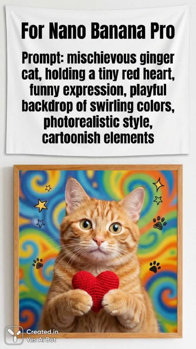 bold black text on white bunner: "For Nano Banana Pro" AND bold black text on white bunner: "Prompt: mischievous ginger cat, holding a tiny red heart, funny expression, playful backdrop of swirling colors, photorealistic style, cartoonish elements"