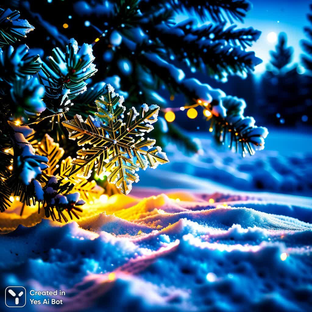 A masterpiece of Night Photography. FOCUS ON TEXTURE AND LIGHT: The crystalline structure of the large, glowing snowflakes resting on the ground is sharp and intricate. The soft, velvet texture of the deep blue snow drifts contrasts with the crisp, bright light of the decorations. The golden bokeh of the string lights on the pine trees creates a warm canopy against the cold night air. The lighting is dramatic, with the glowing snowflakes acting as key light sources, illuminating the snow around them. High contrast and stunning detail. No text.