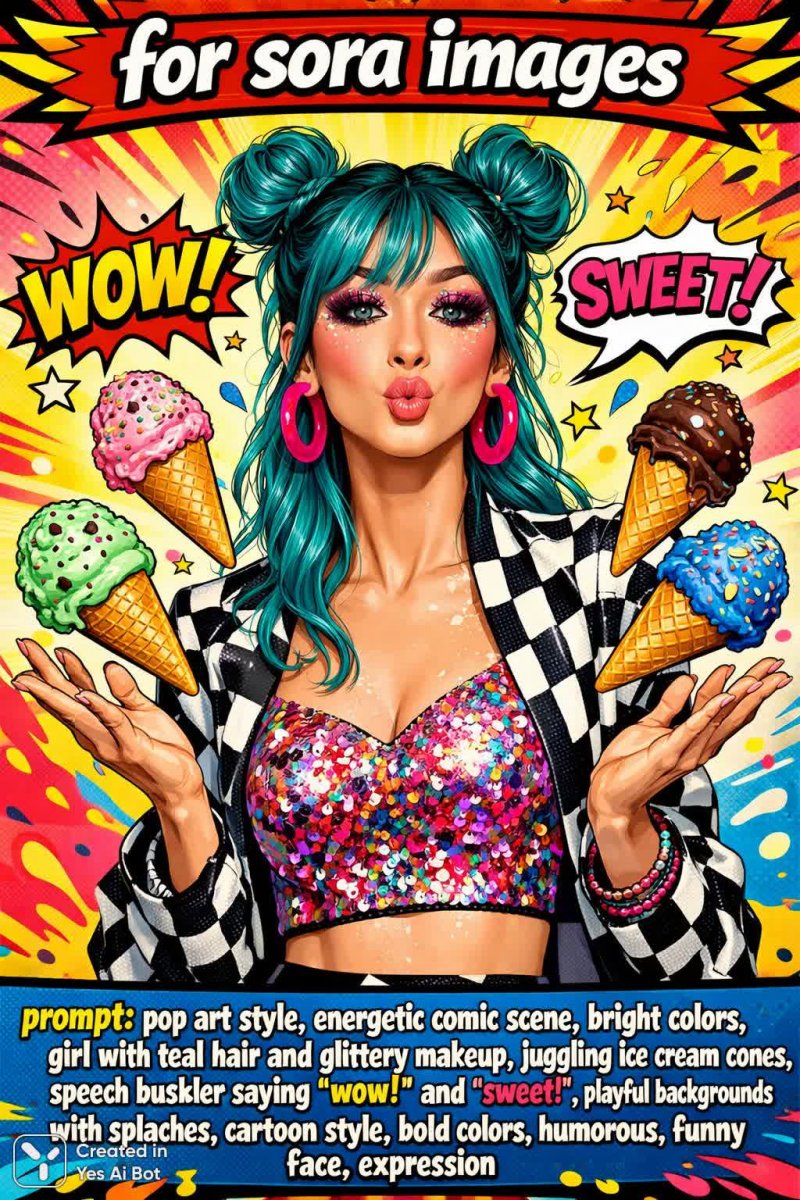 comic style banner with text at the bottom of the image: "Prompt: pop art style, energetic comic scene, bright colors, girl with teal hair and glittery makeup, juggling ice cream cones, speech bubbles saying "WOW!" and "SWEET!", playful backgrounds with splashes, cartoon style, bold colors, humorous, funny face, exaggerated expression"