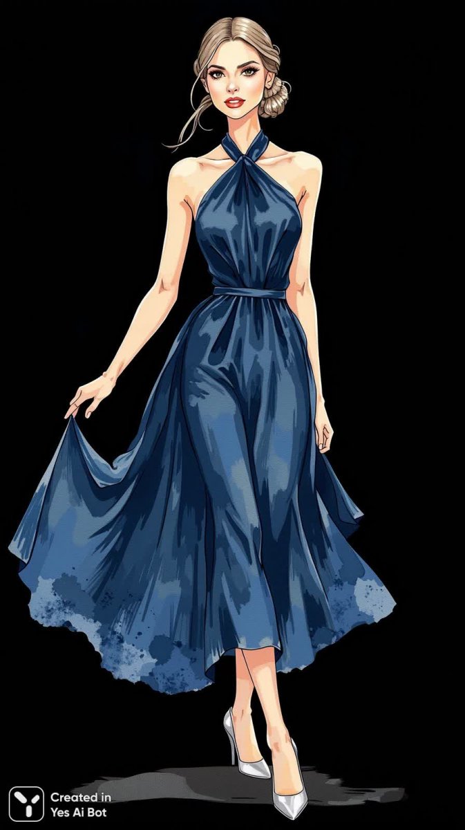Изысканная мода в акварельной технике: завораживающая иллюстрация демонстрирует элегантную женщину в темно-синем платье миди с высокой линией талии и оригинальным вырезом 'халтер'. Идеально сидящий верх плавно переходит в расклешенную юбку, подчеркивая женственность силуэта. Серебристые высокие каблуки добавляют образу нотку роскоши и уверенности. Волосы собраны в гладкий пучок, а минималистичный макияж акцентирует естественную красоту модели. На фоне – простой черный цвет, который позволяет сосредоточиться на деталях костюма и выражении лица. Вся композиция воплощает утонченность, изысканность и вневременную красоту, создавая ощущение элегантной классики, которая никогда не выходит из моды. Это изображение – ода женственности и безупречному вкусу, демонстрирующее гармонию формы и цвета в мире высокой моды. В нем чувствуется легкость акварели и строгость линий, что создает неповторимый визуальный эффект. Этот образ способен вдохновить на создание собственного уникального стиля, сочетающего в себе классическую элегантность и современную изысканность