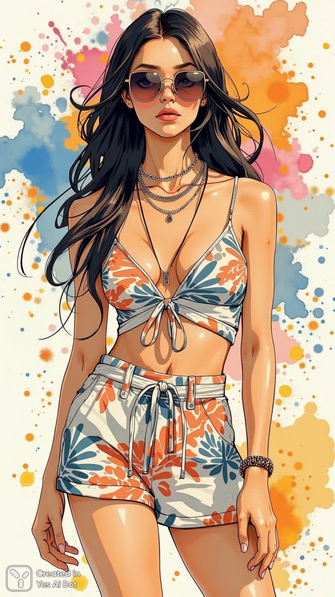 Изящная акварельная иллюстрация моды запечатлевает образ современной женщины в стильном двухкомпонентном комплекте. Кроп-топ с высоким вырезом и соответствующие шорты с высокой талией создают актуальный силуэт, подчеркивающий фигуру. Загадочный взгляд скрыт под большими солнцезащитными очками, а длинные темные волосы, уложенные в пляжные волны, добавляют непринужденности и легкости. Аксессуар в виде многослойных цепочек завершает ансамбль, придавая ему изысканность и индивидуальность. На заднем плане – абстрактная композиция с яркими цветовыми акцентами, напоминающими брызги красок, создающая игривую и праздничную атмосферу. Картина излучает позитив и энергию, передавая ощущение летнего настроения и беззаботности. Это не просто иллюстрация моды, это воплощение стиля, уверенности и женственности в ярких и сочных тонах акварели. Образ идеально подходит для вдохновения дизайнеров одежды, иллюстраторов и всех ценителей прекрасного. Яркие цвета и динамичные мазки создают ощущение движения и жизни, а детализированная проработка позволяет рассмотреть каждую мелочь – от текстуры ткани до бликов на очках. Это произведение искусства станет украшением любого интерьера или оригинальным подарком для любителя моды и живописи