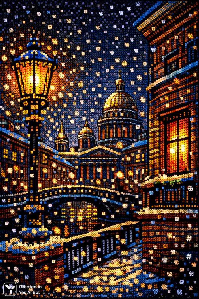 sora Зимний вечер в Петербурге: красочная ASCII-иллюстрация с теплом и волшебством. Изображение из нейронной сети Sora