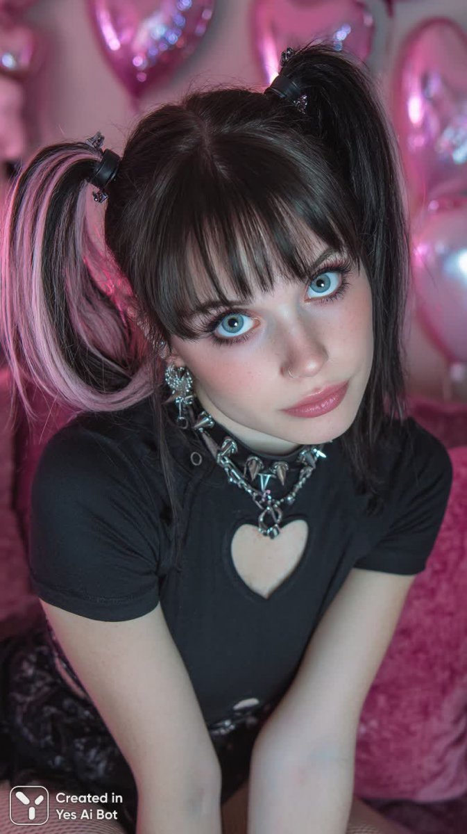 emo goth girl with pink and black pigtail hair, large blue eyes, spiked choker, black crop top with heart cutout, sitting on bed, anime style, bright lighting, pink hearts in background.