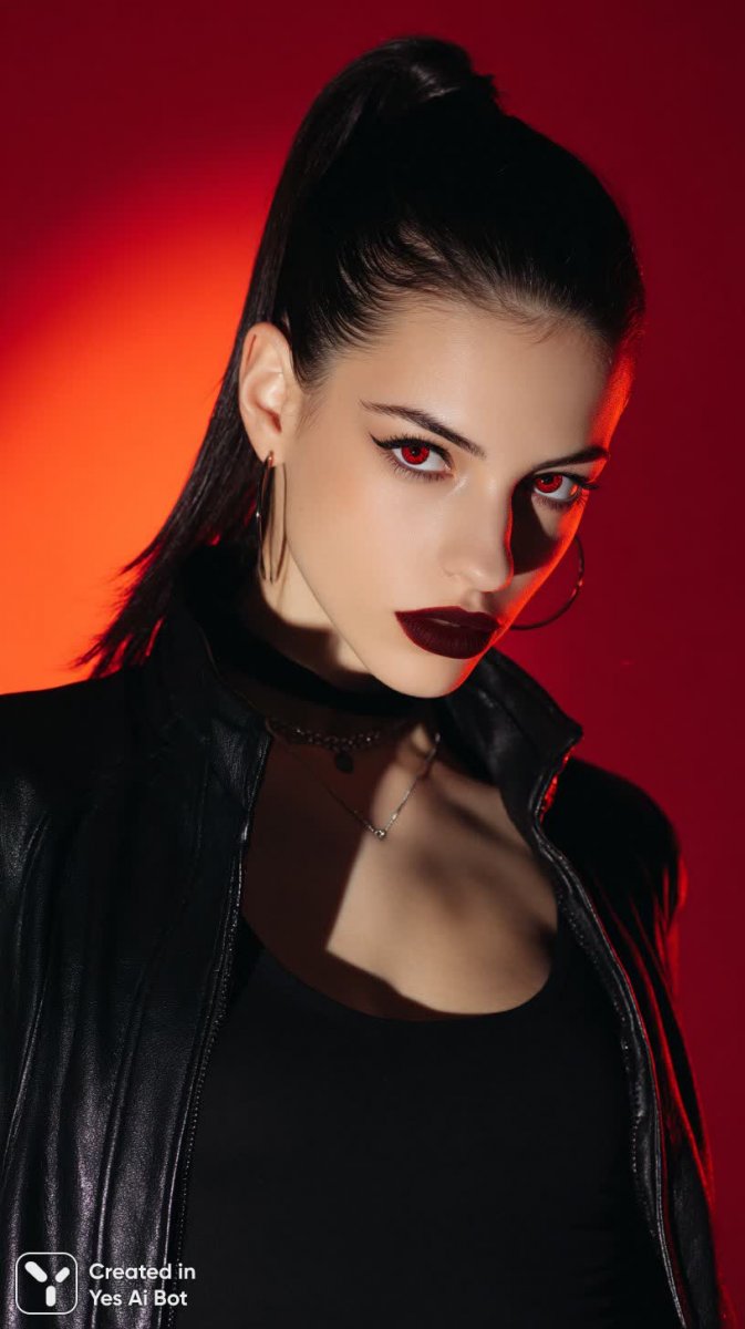 emo girl with long hair in high ponytail, black leather jacket, striking red eyes, black crop top, dark lipstick, heart tattoos under eyes, aggressive pose, bright red and black background, anime art style --style raw