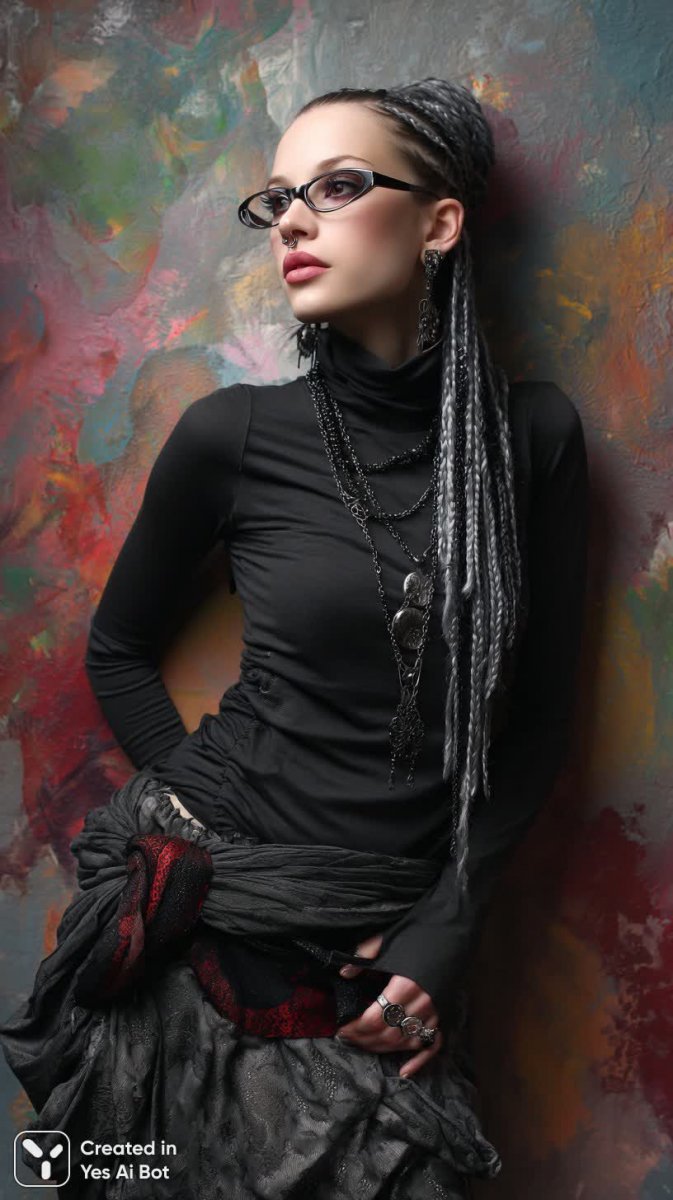 Загадочная готическая красавица с небесно-голубыми косичками излучает уверенность и скрытую силу. Ее фарфоровая кожа контрастирует с дерзким образом: крупные очки придают взгляду интеллектуальную глубину, а длинный кожаный жакет подчеркивает бунтарский дух. Черная укороченная футболка и юбка с ярко-красными полосками создают эффектную комбинацию, акцентируя внимание на ее стройной фигуре. Множество пирсинга добавляют образу нотку провокации и индивидуальности. Серьезный взгляд и уверенная поза с рукой, опирающейся на бедро, говорят о сильном характере и независимости. Фон, выполненный в хаотичной палитре цветов, создает атмосферу загадочности и подчеркивает драматичность момента, словно отражая внутренний мир этой невероятной девушки – сочетание уязвимости и непоколебимой силы, мрачности и яркой индивидуальности, классической готики и современных трендов. Она - воплощение стиля, смелости и самовыражения, способная покорить своей харизмой и оставить неизгладимое впечатление. Ее образ – это заявление о свободе и неприятии общепринятых норм, призыв к исследованию собственной уникальности и принятию своего темного великолепия