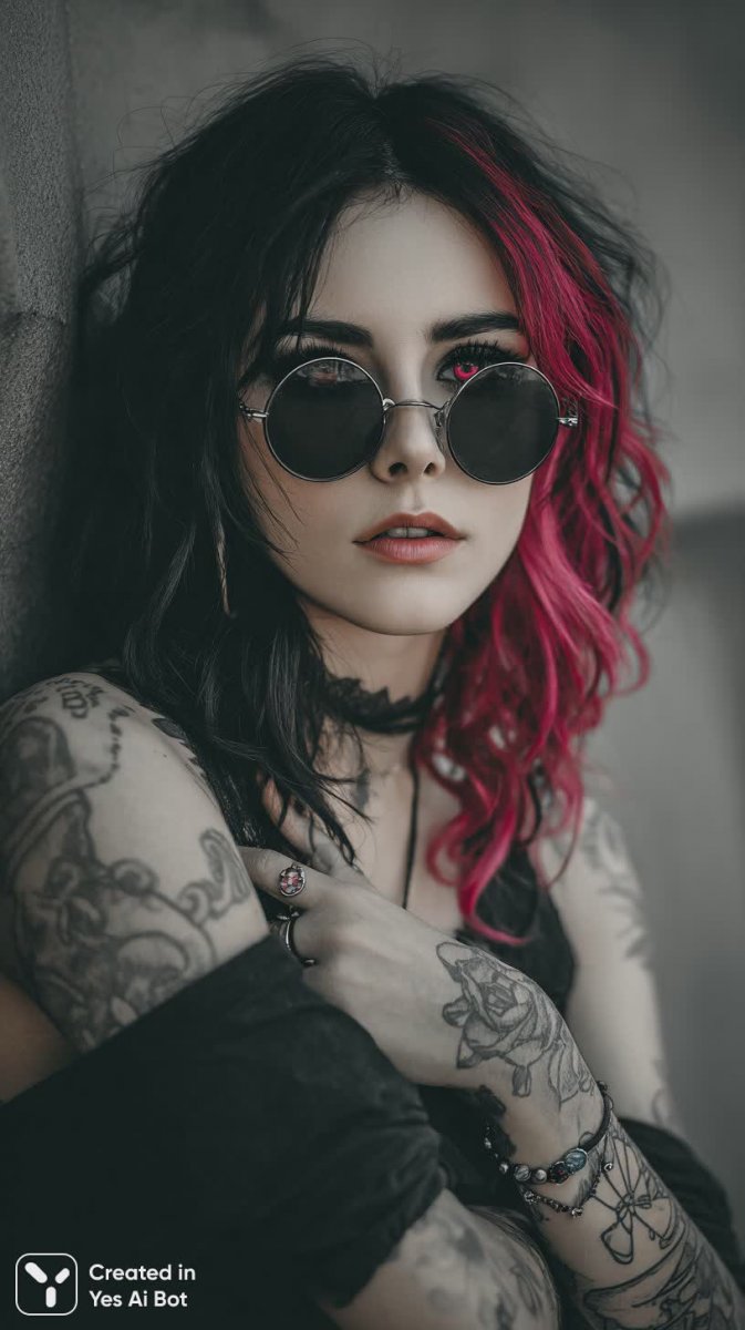 Загадочная и бунтарская юная особа в стиле аниме, воплощающая собой дух рока и непокорности. Ее волосы разделены на две контрастные половины: одна – насыщенный черный цвет, символизирующий глубину переживаний, другая – яркий розовый оттенок, отражающий вспышки эмоций и индивидуальности. Пронзительные красные глаза смотрят исподлобья, выражая одновременно страсть и уязвимость. Круглые солнцезащитные очки скрывают часть лица, добавляя образу элемент таинственности и загадочности. На руках заметны татуировки, свидетельствующие о жизненном опыте и свободе самовыражения. Черный кожаный чокер подчеркивает ее дерзкий характер и готовность бросать вызов общественным нормам. Акцент на интенсивный макияж глаз с помощью подводки создает эффект драматизма и усиливает эмоциональность образа. Вскинутая в жесте рокерской позе рука демонстрирует энергию и уверенность. Фон представляет собой серый городской пейзаж, который служит идеальным фоном для этой бунтарской личности, подчеркивая ее отчужденность и независимость. Картина излучает атмосферу тайны, страсти и непокорности, характерную для эстетики эмо-культуры в аниме-стилистике. Этот образ – воплощение бунта против обыденности и стремление к самовыражению через яркие краски и дерзкий стиль