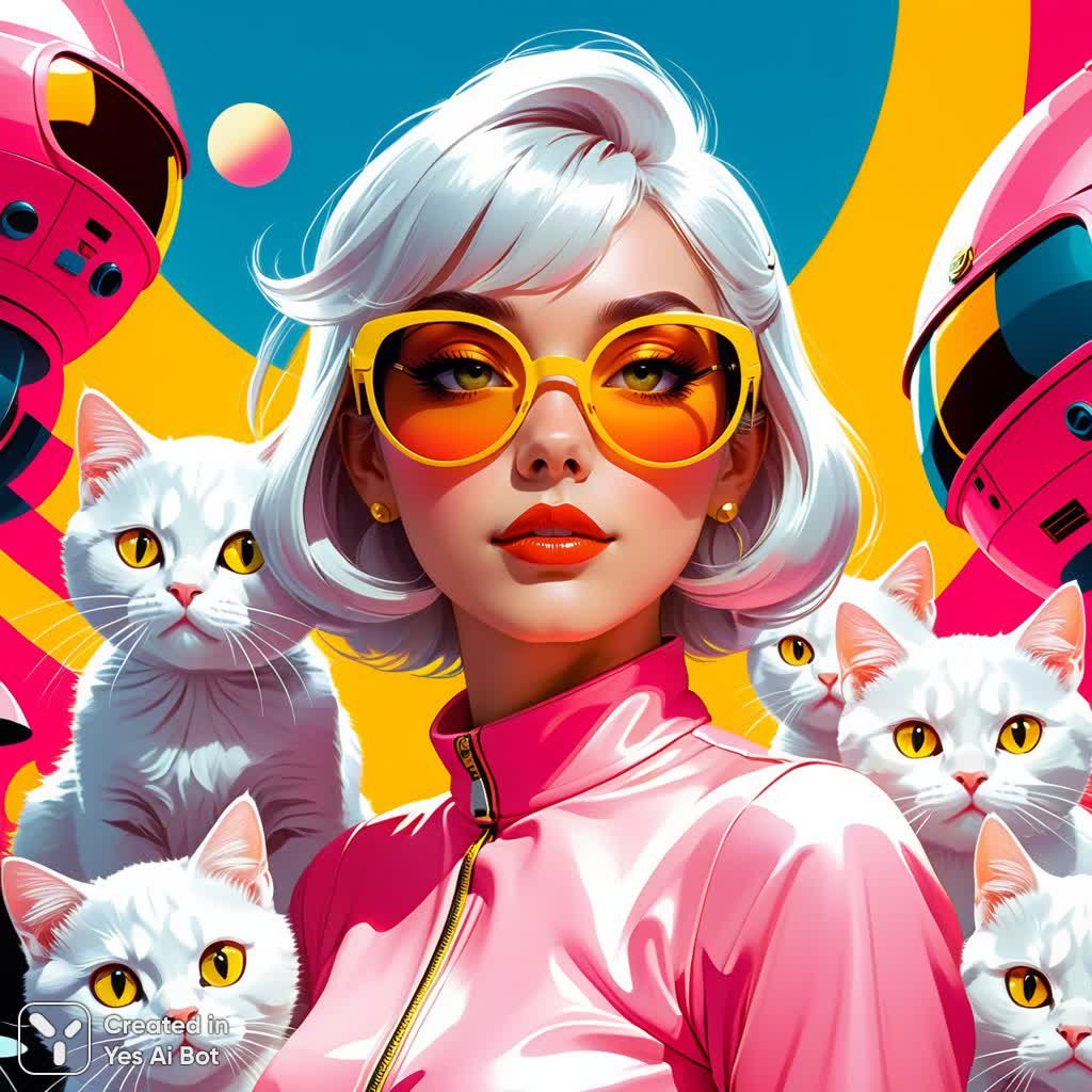 Волшебная встреча: девушка с серебристыми волосами в стильных солнцезащитных очках очаровательно окружена стаей белоснежных кошек. Каждая из них, словно персонаж сказочного мира, наделена забавными желтыми и розовыми очками, придающими им неповторимый шарм. За этой необычной сценой простирается фон насыщенного светло-красного цвета, создающий теплую и уютную атмосферу. Иллюстрация выполнена в ярком, мультяшном стиле, характеризующимся простыми линиями, милыми выражениями лиц и лаконичными формами. Влияние аниме очевидно в общей эстетике работы, подчеркивающей ее легкость и воздушность. Плоский дизайн придает изображению современный вид, делая акцент на четкости линий и насыщенности цветов. Композиция картины выстроена таким образом, что внимание зрителя фокусируется на девушке, занимающей центральное место на переднем плане. Вокруг нее, словно верные спутники, располагаются кошки, создавая ощущение тепла и дружбы. Эта картина – настоящее произведение искусства, наполненное волшебством, красотой и позитивными эмоциями. Она способна подарить зрителю мгновения радости и вдохновения, перенося его в мир фантазий и сказок. Это визуальное воплощение мечты о гармонии между человеком и природой, об искренней дружбе и бесконечной любви к животным