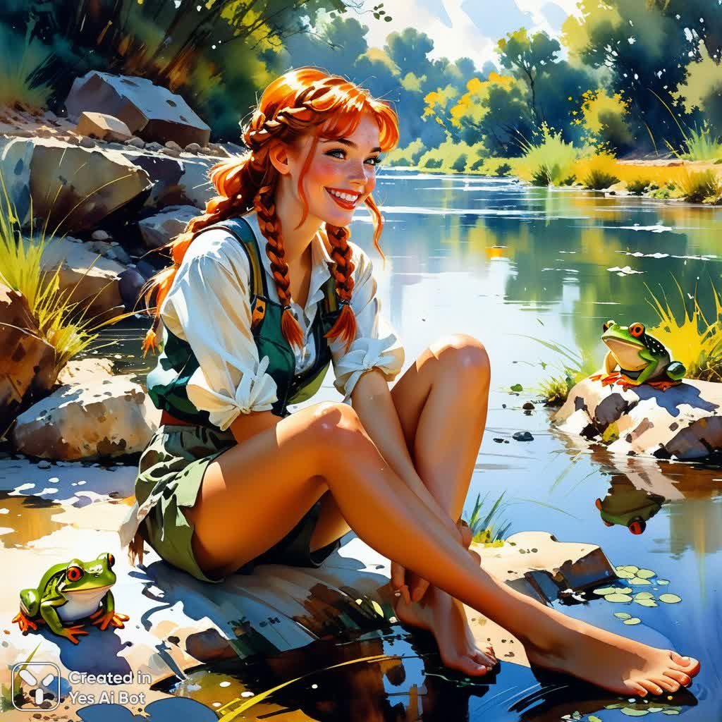 Застенчивая радость и дикая свобода сплетаются в этом трогательном портрете юной девушки. Её медно-рыжие косы, украшенные небрежными плетениями, обрамляют лицо, усеянное веснушками, словно крошечными солнечными зайчиками. Искренний, заливистый смех выдает беззаботный и непосредственный характер. Одежда её – жалкое подобие былой красоты, растрепанная и поношенная, но в этом есть своя прелесть, подчеркивающая ее неприхотливость и связь с природой. Она сидит на берегу реки, словно сливаясь с окружающим пейзажем, а рядом, на своих маленьких лапках, восседает лягушка, застывшая в немом созерцании. В их взглядах читается взаимное любопытство и понимание – тихий диалог двух одиноких душ, находящих утешение друг в друге. Задний план выполнен в мультяшной манере с элементами рустикального стиля, создавая ощущение сказочной реальности. Вся композиция пронизана атмосферой уюта и спокойствия, а мастерская техника исполнения, напоминающая стиль Михаила Гармаша, придает работе особую глубину и выразительность. Это не просто изображение – это запечатленная мимолетная сцена из жизни маленькой мечтательницы, живущей в гармонии с природой и своей собственной душой, наполненная светом, радостью и искренней непосредственностью. Картина излучает тепло и позитив, даря зрителю ощущение умиротворения и светлой грусти