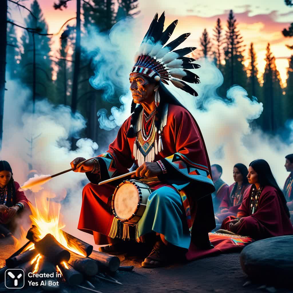 Завораживающая картина ночного леса в Северной Америке, окутанного дымкой костра и плотными облаками. Атмосфера пронизана тишиной и тяжелым воздухом, а приглушенные тона создают ощущение таинственности и древности. В центре кадра – группа женщин из народа коренных американцев, одетых в яркие ткани, полные жизни и красок. Их окружает старый шаман, духовный лидер племени, облаченный в церемониальные одежды, сотканные из натуральных материалов. Он держит священный барабан, готовый призвать силы природы. На одежде каждого присутствующего можно заметить едва уловимые следы ручной росписи и символов – посланий предков и ключей к древним знаниям. Все участники погружены в странный ритуал, исполненный глубоким смыслом и непостижимой для постороннего взгляда силой. Реалистичная и кинематографическая съемка с приглушенным контрастом и натуральными текстурами позволяет зрителю почувствовать себя частью этого мистического действа, ощутить связь с природой и коренными традициями. Картина передает ощущение глубокой связи поколений, мудрости шамана и силы обряда, который проходит вдали от цивилизации, под покровом ночного леса, где время словно замирает, а духи предков наблюдают за происходящим. Это погружение в мир древних верований и ритуалов, наполненное тайной и благоговением перед природой