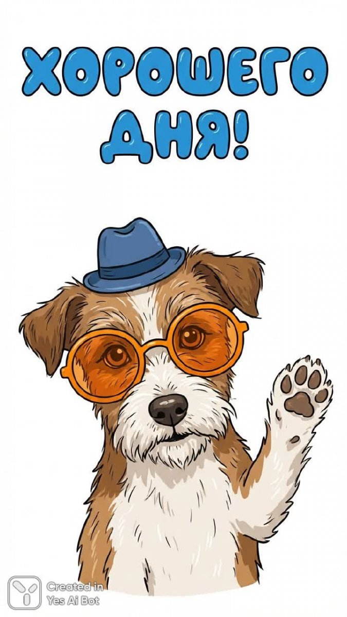 Очаровательный мультфильм посвящен позитивному настрою и заряжает энергией на весь день. В центре внимания – милая собачка с выразительными чертами лица, облаченная в стильную шляпу и модные солнцезащитные очки. Её дружелюбный жест – поднятая лапка – символизирует приветствие и готовность к новым приключениям. Над этой трогательной сценой яркими белыми буквами красуется надпись 'Хорошего дня!', словно личное пожелание от четвероногого друга. Изображение выполнено в забавном, мультяшном стиле, что добавляет ему легкости и беззаботности. Белый фон позволяет всем элементам композиции выгодно выделяться, создавая ощущение чистоты и свежести. Вся картинка пронизана позитивом и оптимизмом, она способна поднять настроение даже в самый пасмурный день. Это идеальный выбор для иллюстраций, открыток или любых других проектов, где требуется передать атмосферу радости и дружелюбия. Яркие цвета и детализированная графика делают этот мультфильм визуально привлекательным и запоминающимся. Он словно приглашает зрителя окунуться в мир веселья и хорошего настроения