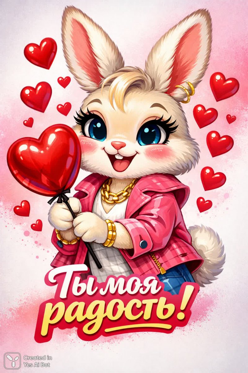 мультяшный кролик с сердечками вокруг, держит в лапах красный шарик, текст "Ты моя радость!" (в конце восклицательный знак) снизу, веселый стиль, яркие цвета, простая композиция.