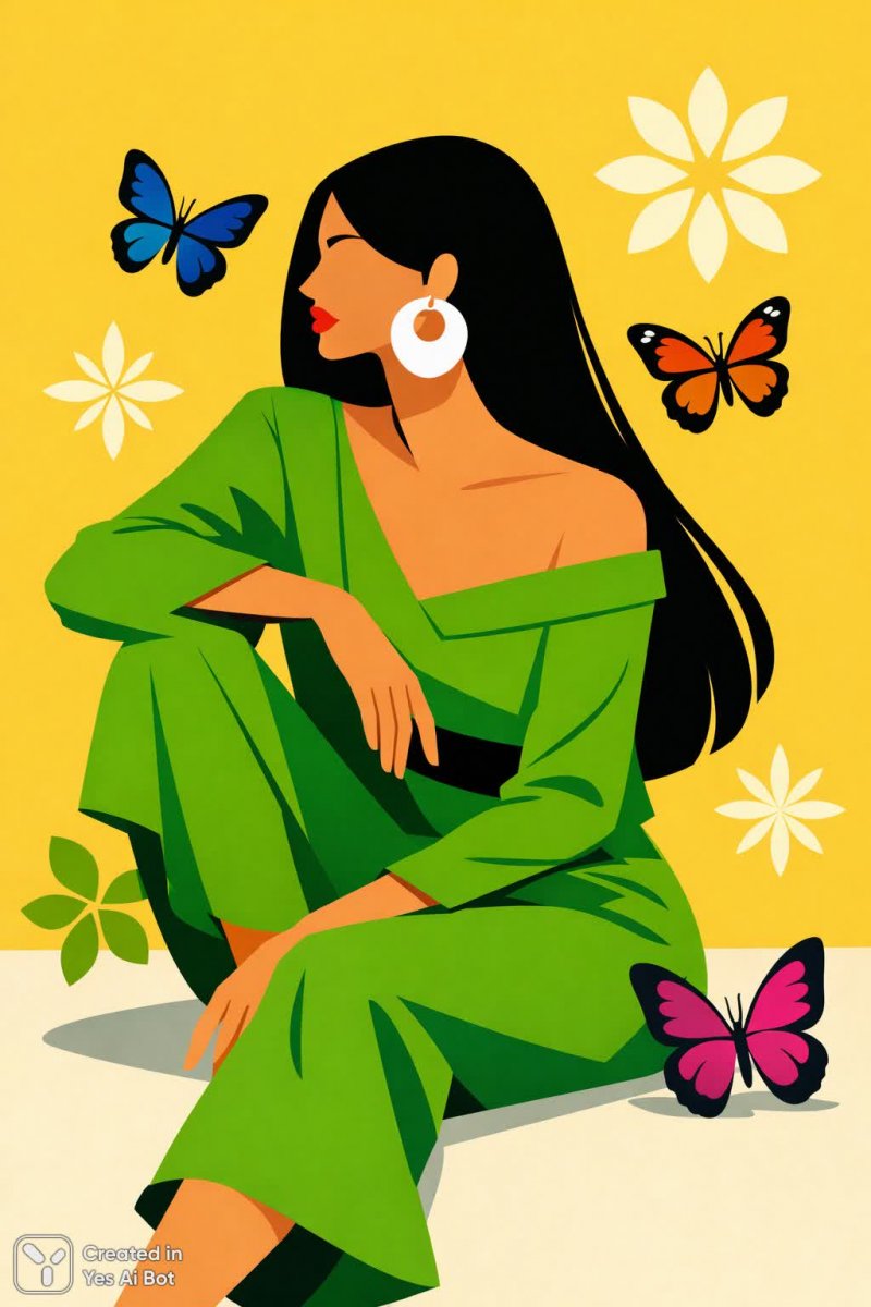 Изящная женская фигура в сочном зеленом наряде – воплощение современной элегантности и гармонии с природой. Длинные черные волосы контрастируют с ярким фоном, создавая динамичный визуальный образ. Крупные круглые серьги добавляют образу нотку утонченности и индивидуальности. Рядом с женщиной порхают пестрые бабочки – символ легкости, преображения и красоты окружающего мира. Минималистичный стиль исполнения подчеркивает чистоту линий и лаконичность композиции. Яркий желтый фон создает ощущение тепла, оптимизма и жизненной энергии. Геометрические цветочные узоры придают иллюстрации современный вид и визуальную сложность. Это плоская векторная иллюстрация в духе современного искусства, выполненная с использованием четких линий и акцентом на простоту форм. Работа демонстрирует мастерство художника в создании стильного и запоминающегося произведения, сочетающего в себе эстетику минимализма и яркость красок. Иллюстрация идеально подойдет для оформления различных дизайнерских проектов – от веб-сайтов и мобильных приложений до печатной продукции и рекламных материалов, где требуется современный и привлекательный визуальный акцент. Она передает ощущение спокойствия, уверенности и внутренней силы
