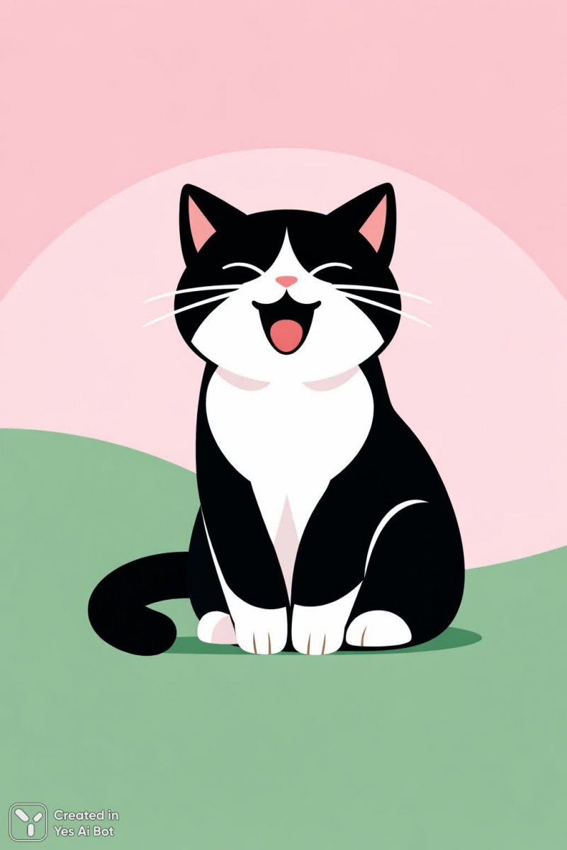 minimalism with black and white cat, sitting on pink and green BG, stylization includes soft curves, geometric shapes, and pastel colors, eyes closed and mouth open, vector art, png.