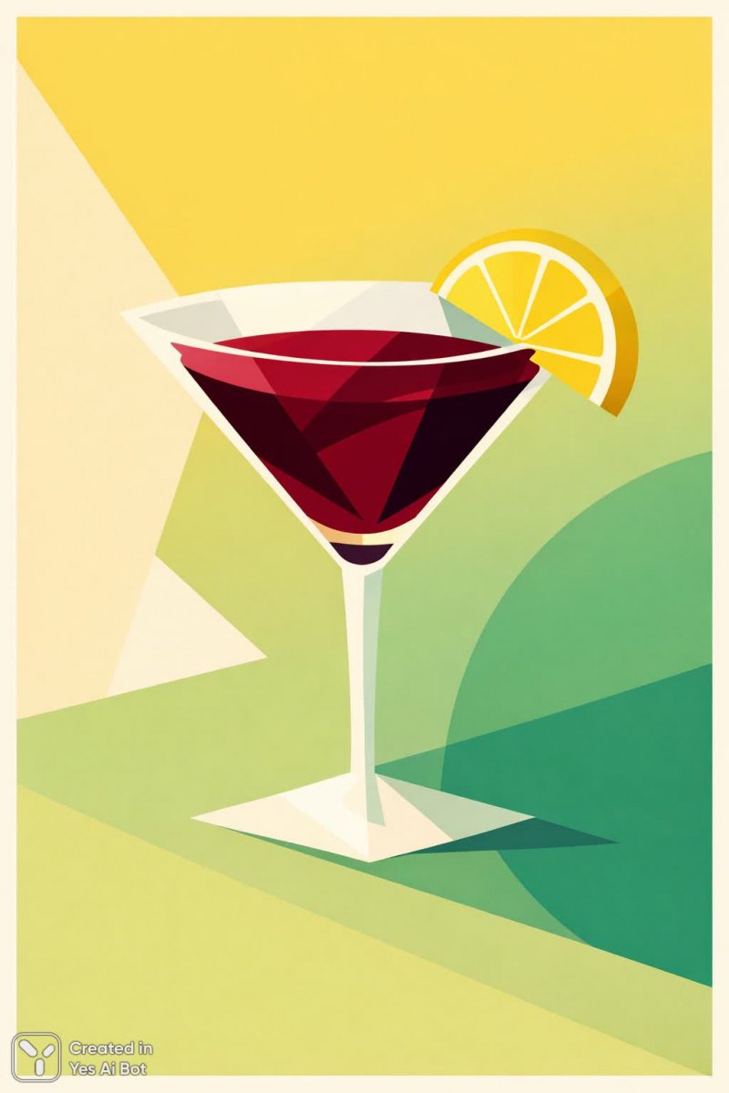 abstract painting of martini glass filled with dark red cocktail, stylization in pastel colors, minimalism featuring geometric shapes, lemon slice on rim, BG gradient of yellow and green, vector art, png.