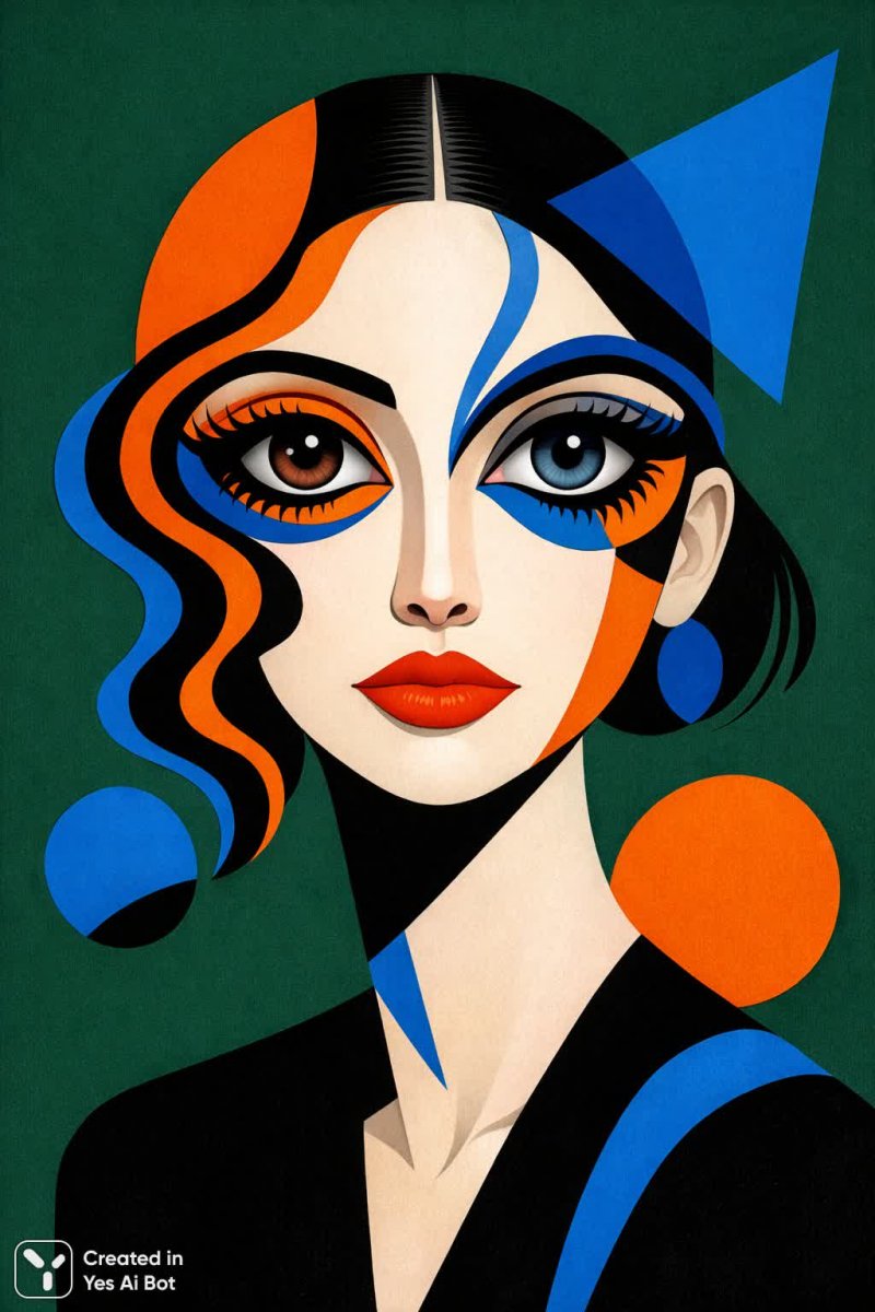 surreal abstract portrait of a woman's face, deep green background with vibrant blue and orange geometric shapes, large expressive eyes surrounded by wavy lines and bold patterns, minimalism and cubism influences, small nose and elongated mouth enhance the unique style.