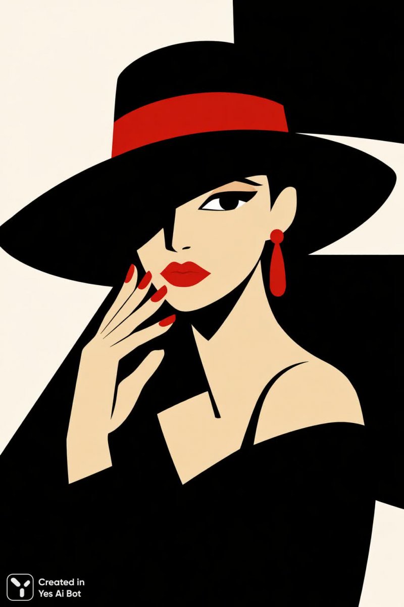 На изображении представлен стилизованный портрет женщины, выполненный в черно-белой гамме с акцентами красного цвета. Главный объект композиции – лицо и верхняя часть тела героини, выделяющиеся на фоне простых, плоских форм в чёрно-белых тонах. На голове у женщины большая чёрная шляпа, украшенная яркой красной лентой, которая придает образу живость и динамику. Детализированный маникюр с красными акцентами добавляет портрету изысканности и завершённости.