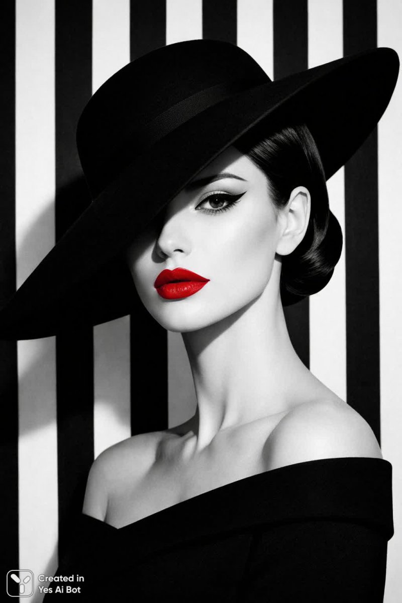 Изысканная элегантность в черно-белом минимализме: портрет женщины с выразительными губами, подчеркнутыми смелым красным цветом, создает яркий акцент на фоне вертикальных полос. Широкополая шляпа, слегка наклоненная, добавляет загадочности и шарма образу, а лаконичная прическа подкрепляет общую концепцию простоты и графичности. Этот снимок – воплощение сдержанной роскоши, где внимание сосредоточено на деталях: идеальная форма губ, выразительный взгляд, игра света и тени на лице, создающая эффект объемности. Вертикальные линии фона усиливают визуальный ритм композиции, подчеркивая вертикальность фигуры и добавляя динамизма статичному портрету. Образ излучает уверенность и независимость, сочетая в себе классическую красоту и современный минимализм. Это не просто фотография, а стилизация, где каждый элемент играет свою роль в создании гармоничного и запоминающегося визуального впечатления. Кажется, будто застывшее мгновение, плененное черно-белой гаммой, рассказывает историю о сильной и уверенной в себе женщине, выбирающей простоту и элегантность в каждой детали своего образа. Идеальный баланс между классикой и модерном делает этот портрет истинным произведением искусства