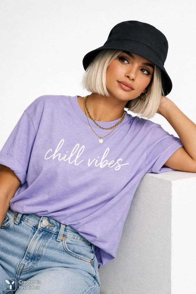 professional photo, sony alpha 7c, 50mm lens, side angle, trendy girl, platinum blonde bob, olive skin, wearing oversized lavender t-shirt with “CHILL VIBES” handwritten across chest, ripped light-wash mom jeans, black bucket hat, gold necklaces, relaxed pose leaning on white cube, photorealism, high detail, crisp studio lighting, clean white bg, focus on print.
