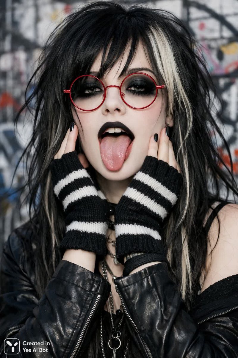pale emo girl with long hair in messy buns, round red glasses, sticking out tongue, black and white striped fingerless gloves, dark makeup, urban graffiti background, digital art portrait.