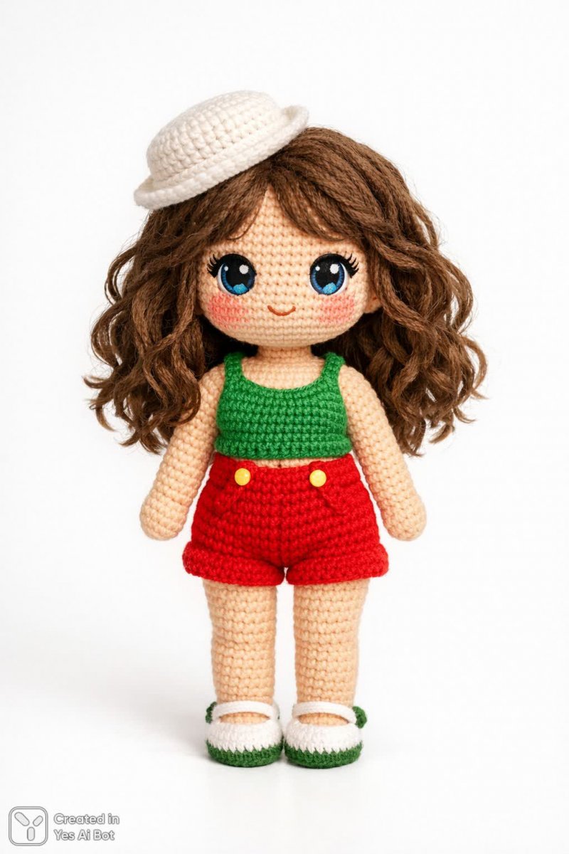 crocheted doll with wavy brown hair, wearing a green striped top and red shorts, round face with bright blue eyes, accessorized with a small white hat, standing upright on plain white BG, high-quality, soft lighting, highlighting unique style and vibrant colors of outfit.
