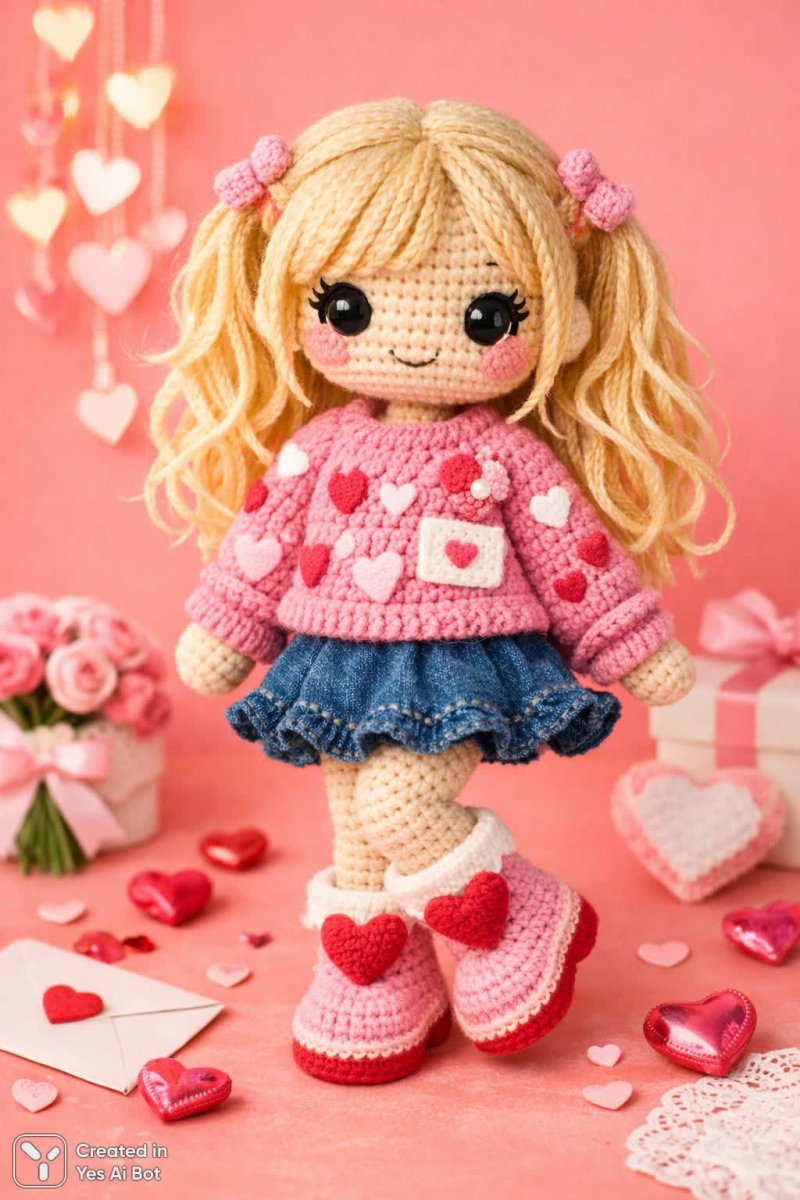 crocheted doll with golden blonde hair, wearing a pink sweater with love motifs, denim skirt, and cute heart-shaped boots, BG is light coral, high-quality, bright lighting, emphasizing whimsical style and joyful atmosphere of Valentine's Day.